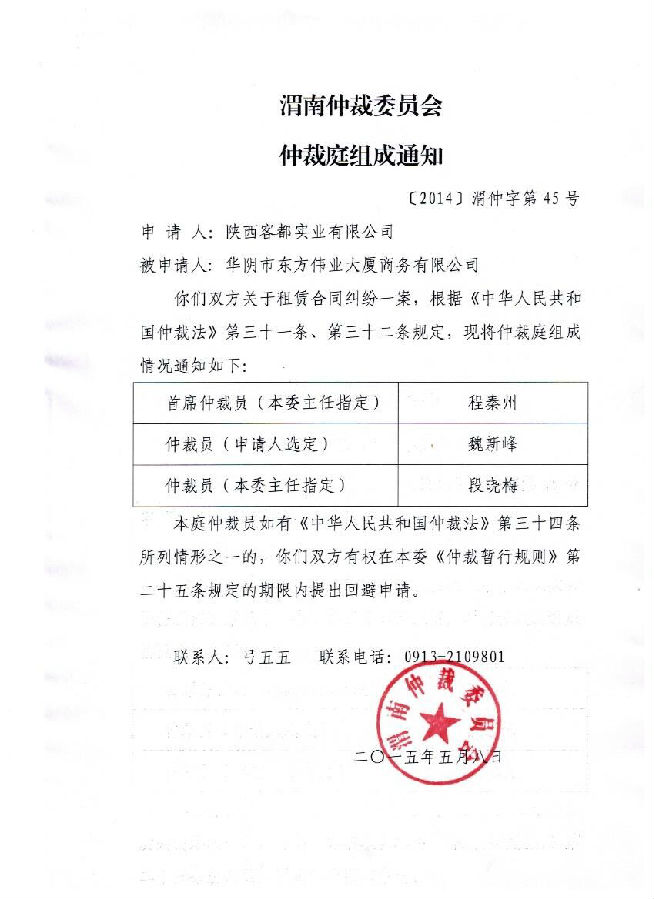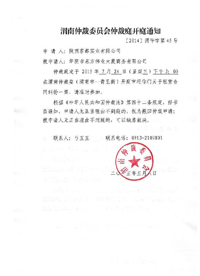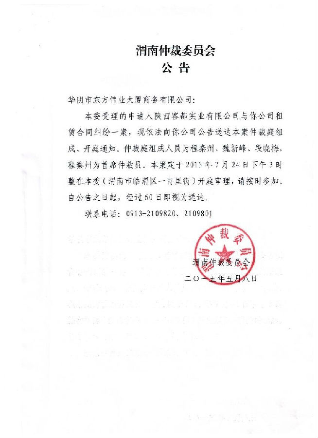 [2014]渭仲字第45號(hào)案件組、開(kāi)庭通知及公告