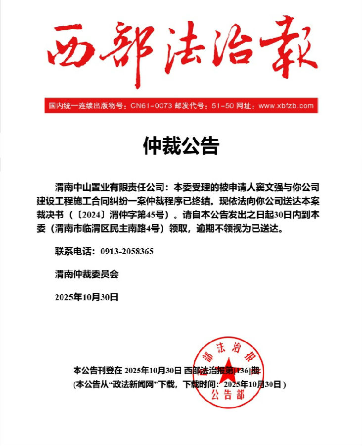 渭南中山置業(yè)有限責(zé)任公司與竇文強(qiáng)建設(shè)工程施工合同糾紛案公告